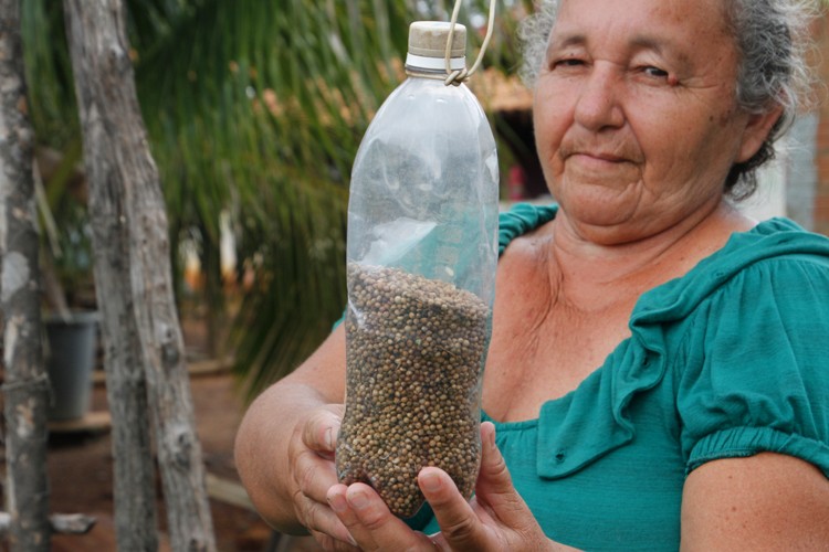 Dona Maria recebeu a equipe do Mandacaru em sua casa e num pequeno canteiro no quintal da família mostrou a cebolinha e o coentro que há muito tempo cultiva. Na oportunidade dona Maria doou uma pequena quantidade de sementes de coentro para que o Mandacaru multiplique nas hortas garantindo novamente a fartura dessas sementes nativas já bem raras na região.